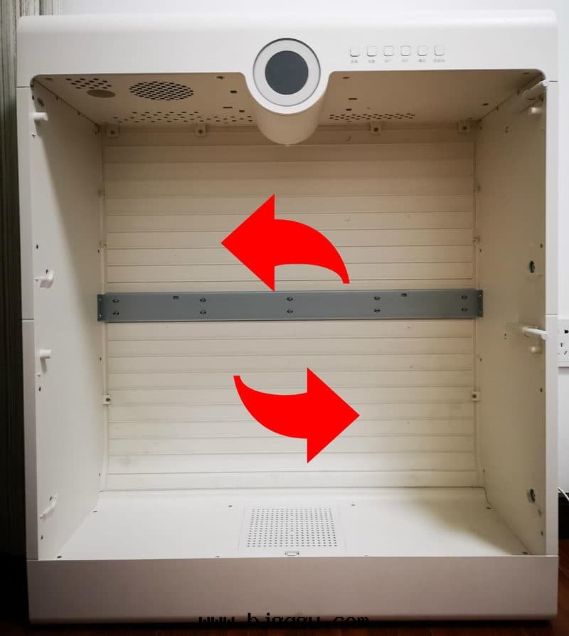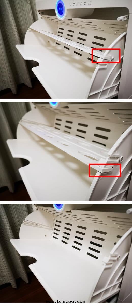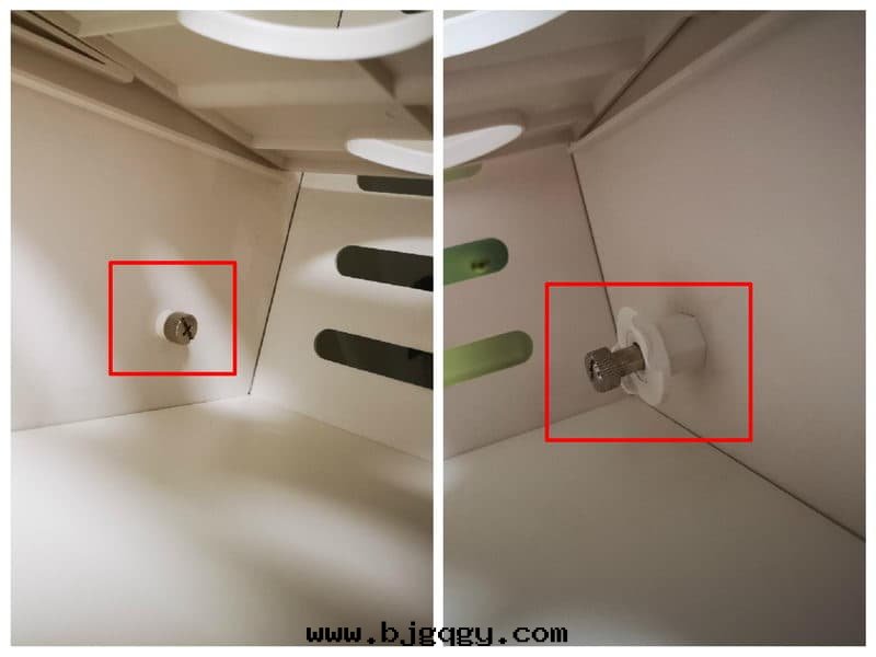 ▼为(wèi)了更方(fāng)便了解(jiě)根(gēn)元智能(néng)鞋(xié)柜的(de)内部(bù)結構,動(dòng)手(shǒu)拆除鞋(xié)架吧,拆除过(guò)程也很方(fāng)便,每层(céng)鞋(xié)架两(liǎng)邊(biān)都有(yǒu)明(míng)顯的(de)螺丝(sī),並(bìng)且(qiě)可(kě)以(yǐ)直(zhí)接徒手(shǒu)旋下(xià),同(tóng)时(shí)右(yòu)侧還(huán)多(duō)了一个(gè)六(liù)方(fāng)銷釘,目的(de)是(shì)讓開(kāi)關(guān)門(mén)可(kě)以(yǐ)缓慢(màn)進(jìn)行。裝(zhuāng)回(huí)过(guò)程也很簡單,只(zhī)需要(yào)将鞋(xié)架放(fàng)入(rù)到(dào)底就(jiù)可(kě)以(yǐ)自(zì)動(dòng)对(duì)齊孔位(wèi)了。
