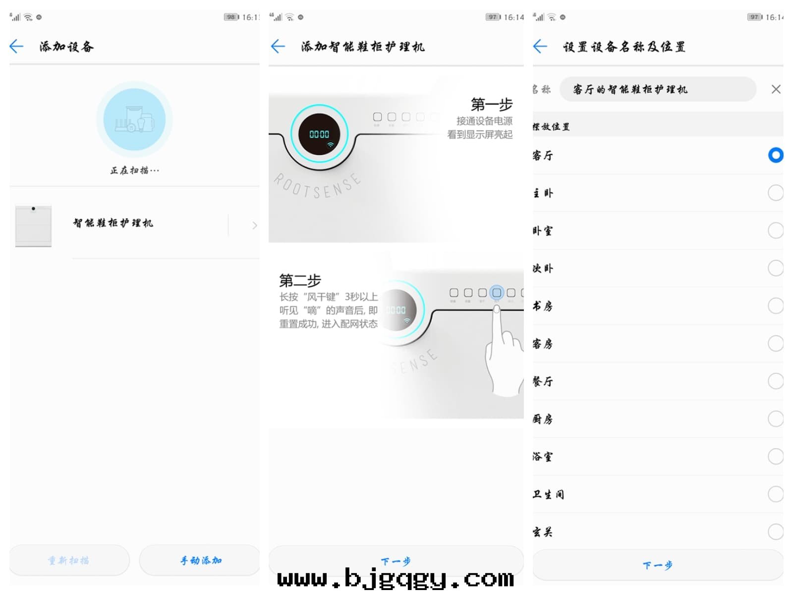 ▼初次(cì)使用(yòng)根(gēn)元智能(néng)鞋(xié)柜,打(dǎ)開(kāi)华为(wèi)智能(néng)家(jiā)居(jū)APP,根(gēn)據(jù)提(tí)示会(huì)自(zì)動(dòng)搜索到(dào)鞋(xié)柜産品,如(rú)果(guǒ)未掃描到(dào)設備可(kě)以(yǐ)選擇手(shǒu)動(dòng)添加,按照操作(zuò)重(zhòng)置鞋(xié)柜就(jiù)好(hǎo),接着根(gēn)據(jù)實(shí)際情(qíng)況選擇擺放(fàng)位(wèi)置、名(míng)稱等等。