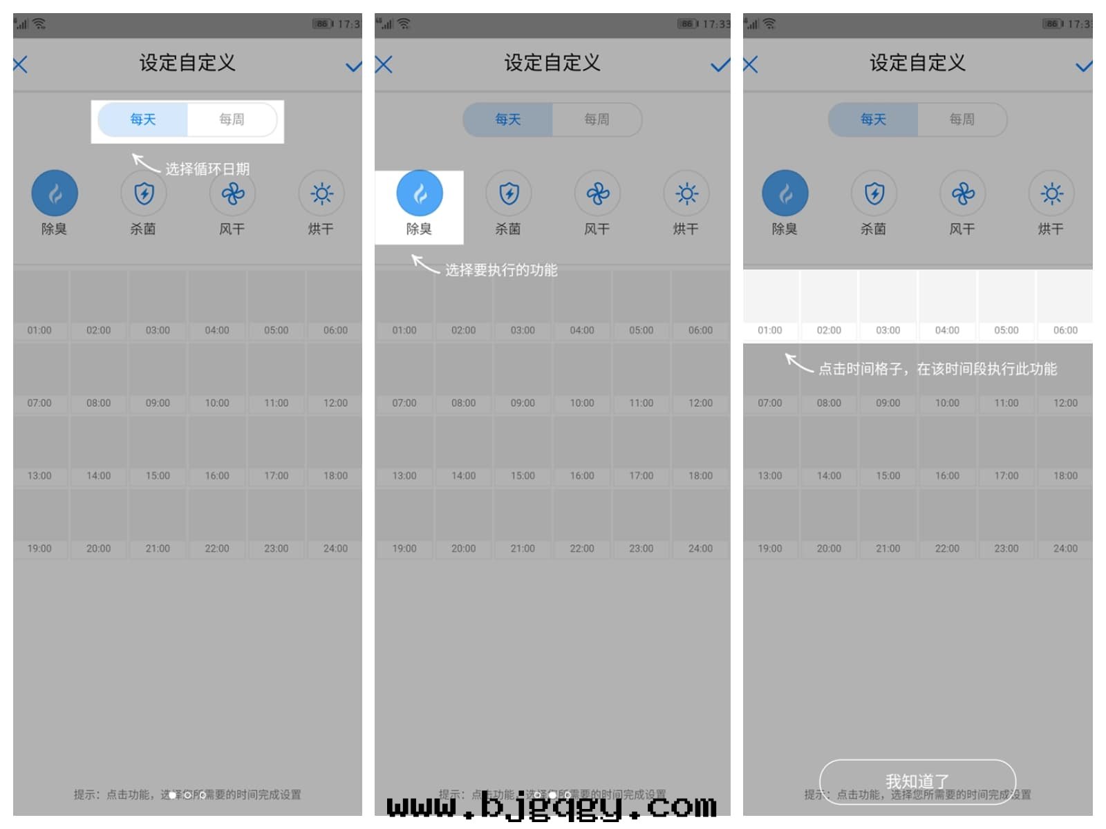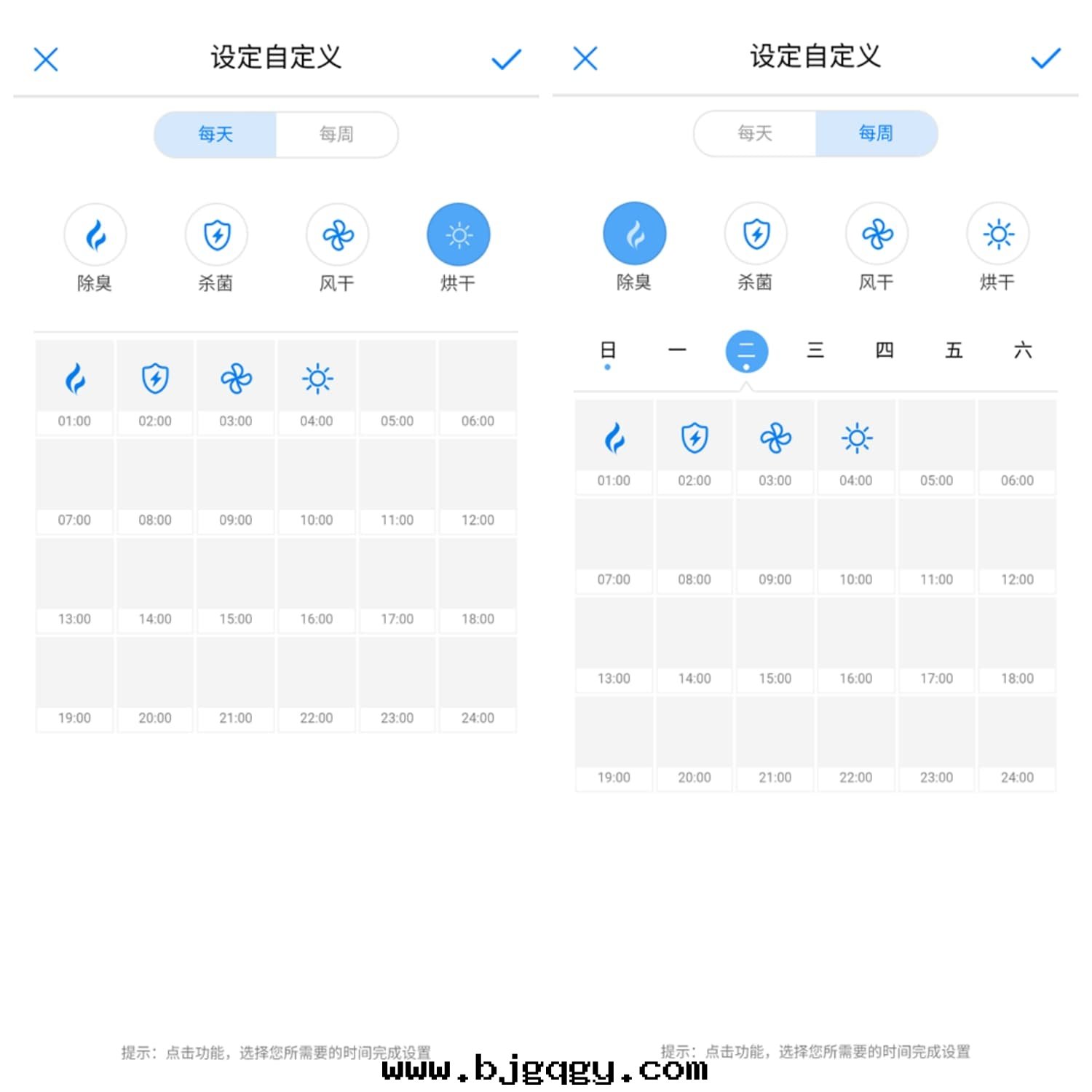 ▼最个(gè)性(xìng)化的(de)設置那(nà)就(jiù)是(shì)自(zì)定(dìng)義的(de)操作(zuò)了。在(zài)自(zì)定(dìng)義設置页(yè)面(miàn),可(kě)以(yǐ)讓根(gēn)元智能(néng)鞋(xié)柜在(zài)你想(xiǎng)要(yào)的(de)时(shí)間(jiān)進(jìn)行特(tè)定(dìng)的(de)工作(zuò),選擇循环(huán)日(rì)期(qī)、執行的(de)功能(néng)以(yǐ)及(jí)每天(tiān)具體(tǐ)執行的(de)时(shí)間(jiān)段(duàn)。