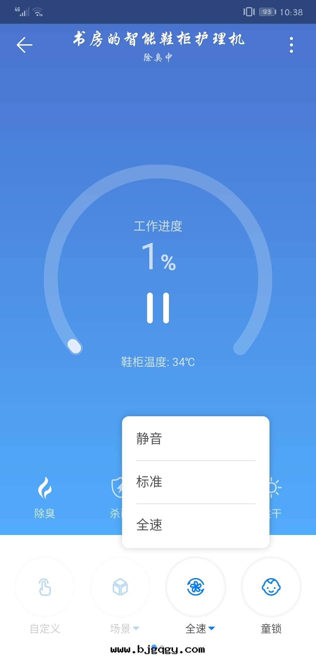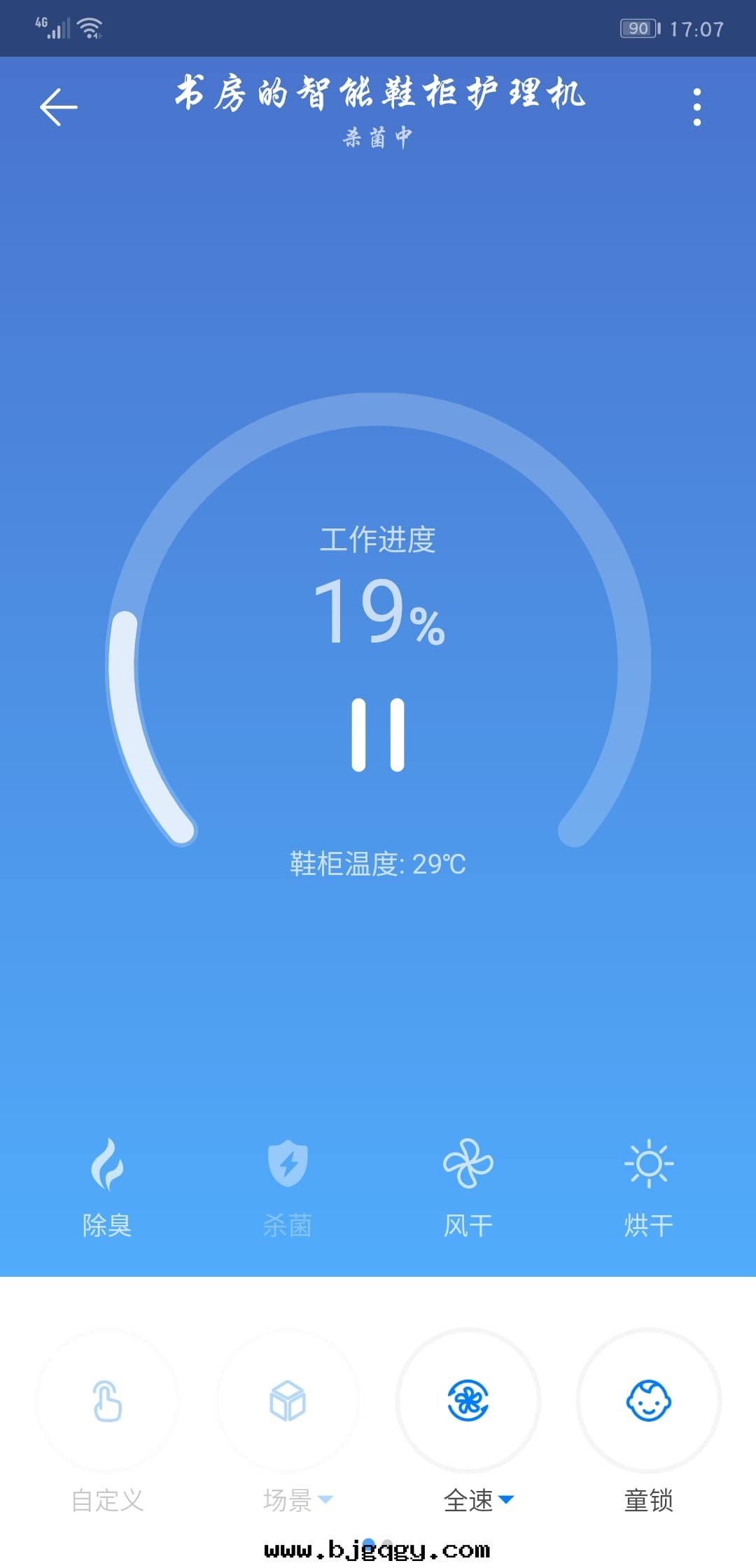 ▼進(jìn)入(rù)APP的(de)鞋(xié)柜護理機(jī)的(de)首页(yè),可(kě)以(yǐ)一目了然的(de)看(kàn)到(dào)鞋(xié)柜的(de)工作(zuò)進(jìn)度(dù)、温度(dù)等情(qíng)況,並(bìng)可(kě)以(yǐ)直(zhí)接利用(yòng)APP選擇開(kāi)始或(huò)者(zhě)暫停工作(zuò)。下(xià)方(fāng)的(de)具體(tǐ)詳细(xì)的(de)功能(néng)按鈕,不(bù)同(tóng)的(de)功能(néng)選擇,不(bù)同(tóng)的(de)场(chǎng)景設置等等,後(hòu)續将一一介紹。