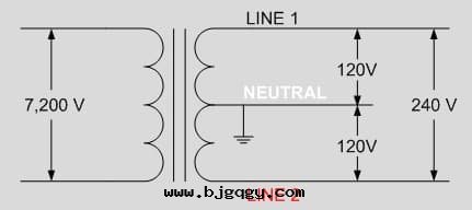 1. 美(měi)加市(shì)內(nèi)高(gāo)壓配電(diàn)是三(sān)相,但到(dào)最(zuì)後(hòu)一(yī)级的(de)配電(diàn)变壓器是單相,主(zhǔ)線(xiàn)圈一(yī)端接地(dì),使用(yòng)大(dà)地(dì)作(zuò)为(wèi)回(huí)路(lù)。次(cì)级線(xiàn)圈中(zhōng)間(jiān)抽头(tóu)接地(dì)作(zuò)为(wèi)回(huí)路(lù), 線(xiàn)圈上端对(duì)中(zhōng)間(jiān)抽头(tóu)和(hé)線(xiàn)圈下(xià)端对(duì)中(zhōng)間(jiān)抽头(tóu)都是 120V輸出(chū)。 次(cì)级線(xiàn)圈的(de)两(liǎng)端電(diàn)壓是 240V。