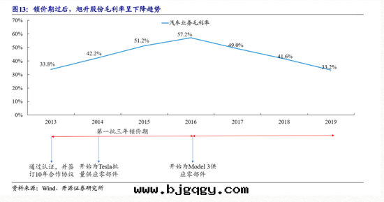 然而(ér),一(yī)邊(biān)是營收(shōu)的(de)增长(cháng),另(lìng)一(yī)邊(biān)則是毛(máo)利率的(de)急速下(xià)滑:2016 年(nián)起(qǐ),旭升(shēng)对(duì)特(tè)斯拉的(de)汽車業務(wù)毛(máo)利率一(yī)路(lù)從 57.2% 下(xià)滑到(dào)了(le) 2019 年(nián)的(de) 33.2%。